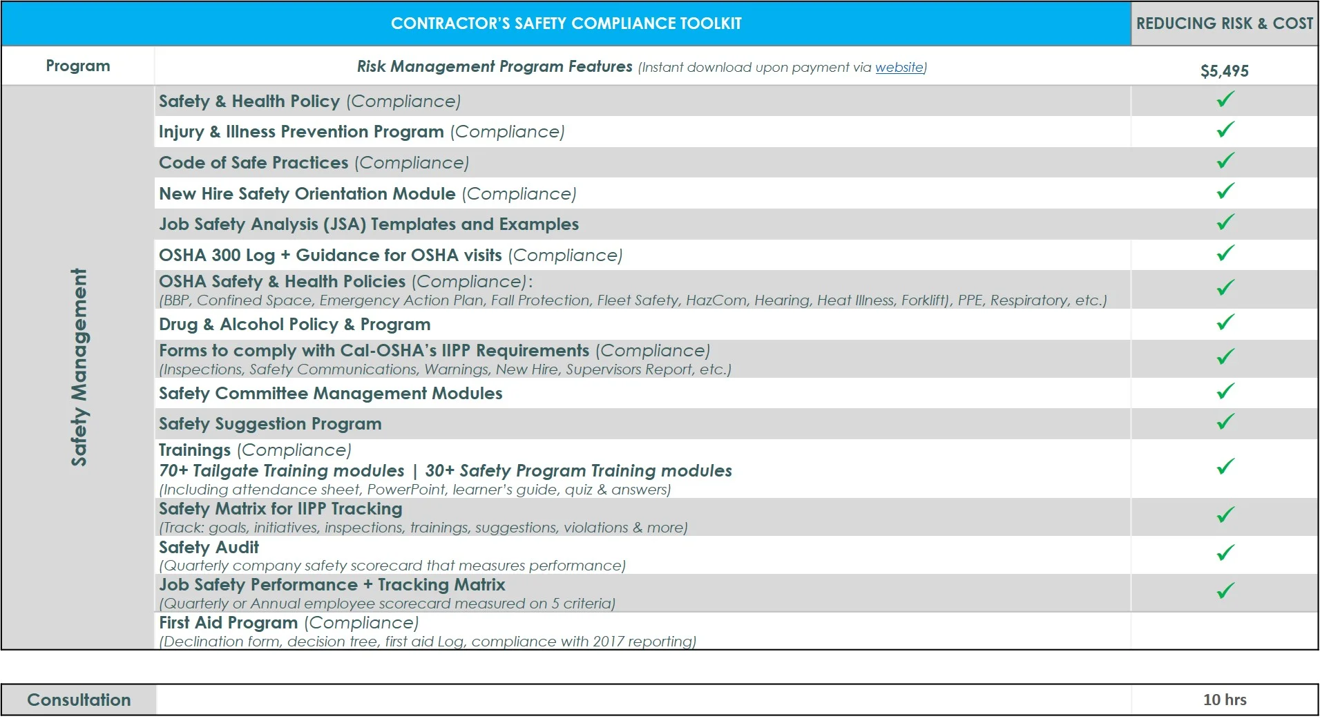 The ESM Contractor's Safety Toolkit is a comprehensive out-of-the-box Safety Management program. This written compliance program includes over 350+ best practices, tools and trainings that have been developed in working with 500+ employers over 12 years. Our program can help you minimize injury exposures, control your Experience Modification Rate (EMR / X-Mod) and Workers’ Compensation costs while also assisting with avoiding potential costly Cal-OSHA penalties.