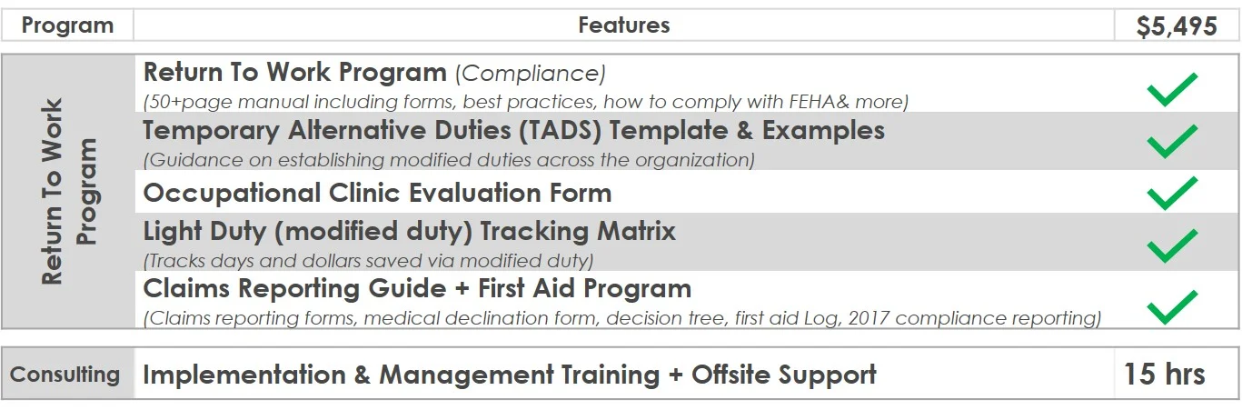 The ESM Return To Work program provides employers with the tools and best practices to develop and manage the RTW process. This includes employee, doctor and carrier management tools, lost day and Temporary Disability savings matrix as well as compliance tools for managing applicable parts of Americans with Disabilities Act (ADA), Family and Medical Leave Act (FMLA) and California’s Fair Employment and Housing Act (FEHA)